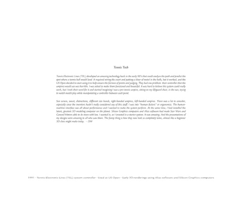 1991 • Tennis Electronic Lines (TEL) system controller • Used at US Open • Early 3D renderings using Alias software and Silicon Graphics computers